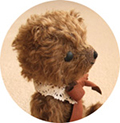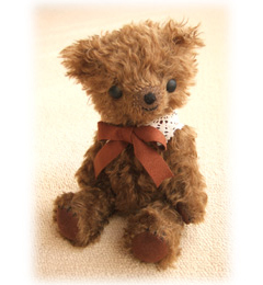 ツヤツヤな毛並みの子です。 スエード調のリボンに幅広のレースを縫いつけ、襟に見立てています。
