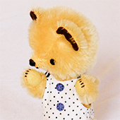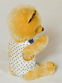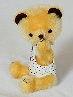 ロンパースを着た赤ちゃんベア。 ボタンのようなアップリケは和紙で出来ています。 誕生日は8月15日